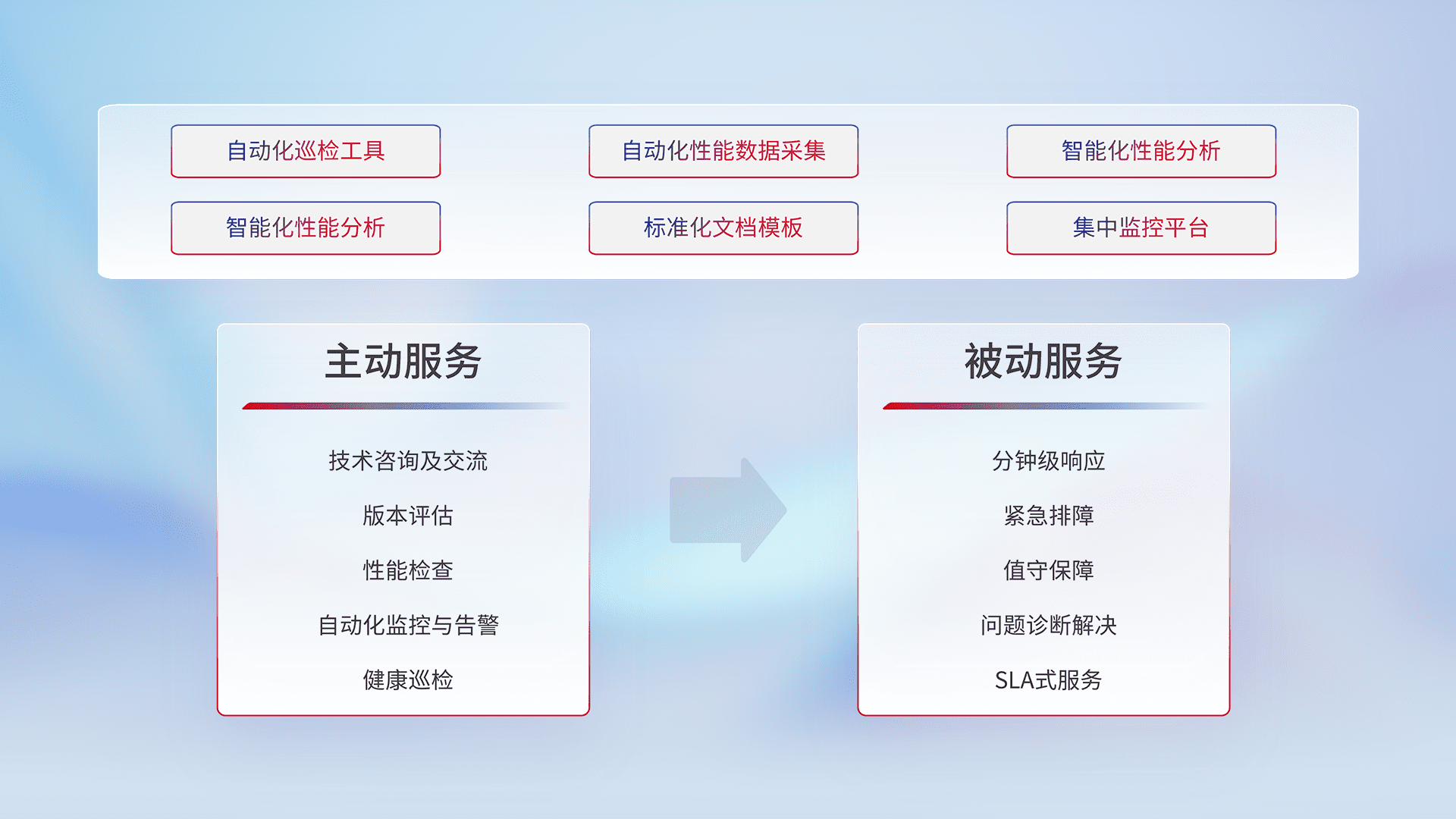 智能化工具和标准化文档,,保障服务质量,,提供主动服务(包含技术咨询、、、版本评估、、、性能检查、、自动化监控与告警、、、健康巡检)和被动服务包含(分钟级响应、、紧急排障、、、值守保障、、问题诊断解决、、SLA服务)。。